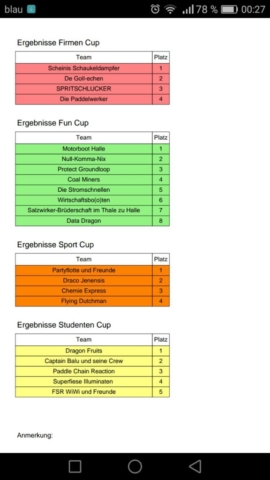 Im Finallauf gegen 16:40 trafen wir dann auf Teams wie „Dragon Fruits“, „Coal Miners“ und die bekannten „Wirtschaftsbo(o)ten“. Es war ein harter Finallauf. Wir fuhren über die ganze Distanz eine recht hohe Schlagzahl, welche uns ziemlich viele Körner kostete und teilweise durcheinander brachte. Im Ziel standen dann aber nochmal 26 Zehntel weniger auf der Uhr als im 2. Zeitlauf. Nur die „Coal Miners“ waren schneller. Das bedeutete für uns Platz 6 im Fun Cup. Darüber wären wir sehr zufrieden gewesen. Bei der Endauswertung stellte sich dann heraus, daß einige Teams in den Kategorien Firmen Cup oder Studenten Cup gewertet wurden. So stand für uns am Ende ein 5. Platz im Fun Cup. Unserer guten Laune tat das keinen Abbruch. Mit einem Paddler weniger und 3 „Rookies“ im Boot war das eine tolle Leistung.